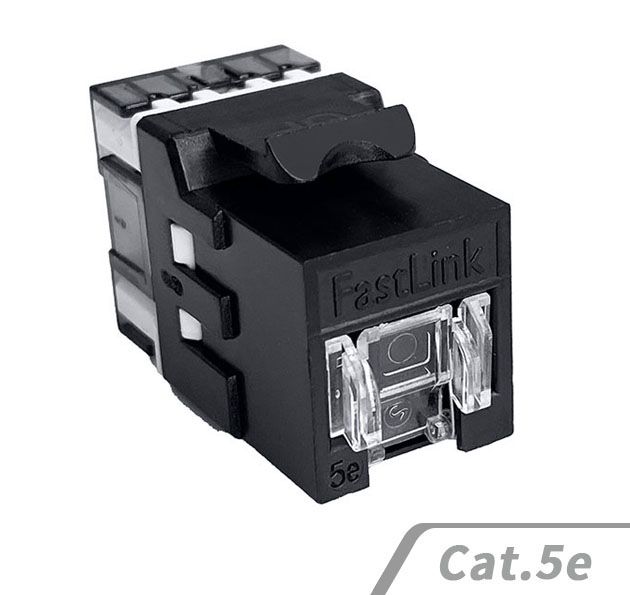FastLinkcabsys Cat.5e RJ45非遮蔽式180度資訊插座可搭配Cat.5e跳線,具有優越的性能表現。接觸點採用50μ鍍金層的鍍鎳插頭,能有效減少信號損失,確保穩定順暢的連接。外殼由防火且耐高溫的熱塑性材料製成,具備高安全性與耐久性。配有110型 IDC 接線端子和壓線蓋提供額外的保護。
